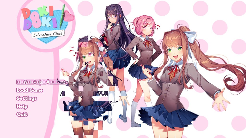 As we talked about last time, Doki Doki Literature Club (DDLC) is a game about dating in high school, which, if you’re an introvert like me, you would not be surprised to find out is a psychological horror game. The four girls in DDLC, or “dokis” as the Internet seems to call them, are all part of a literature club, and want You to join them for all their literature shenanigans, and possibly, if you write your poems right, a little bit more.