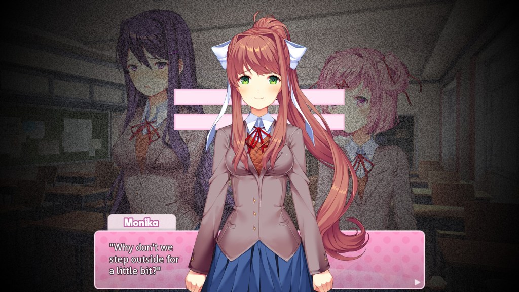 After all, once Sayori becomes club president, she becomes the obsessive one. So perhaps instead of Monika actually being obsessed with the player, it’s some sort of failsafe for the programming that is keeping her locked in the game.