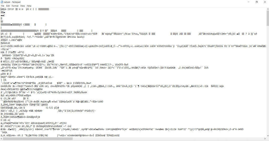 Her character file is, likewise, a bunch of gibberish. I was stumped by this one, since the other character files said the type of file it needed to be in order to be decipherable.